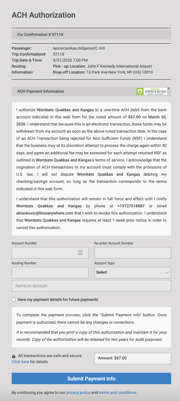 Every ACH interaction requires your customer to complete a secure authorization form. These forms are hosted on a verified, secured page carrying the GoDaddy Verified and Secured seal. Each link is unique to the customer and booking – it cannot be reused or redirected. Bank details are entered directly by your customer, meaning they are never handled or viewed by you or anyone on your team.