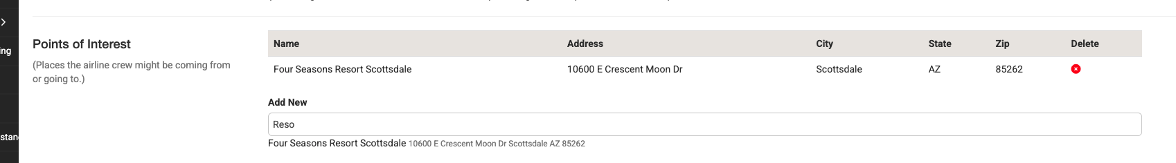 - Add all serviced hotels as Points of Interest. The crew member selects their destination from this list, so it needs to be complete. Make sure each hotel is added as a Point of Interest in your system first.