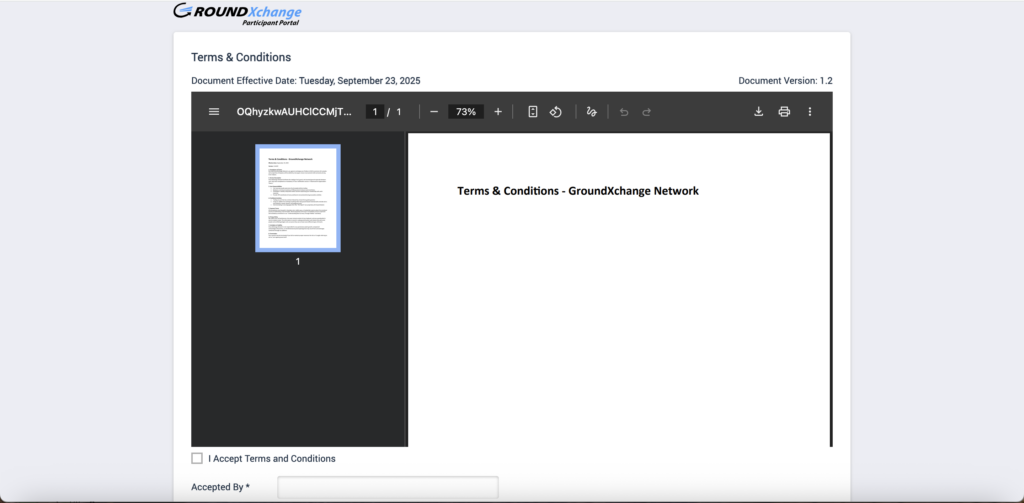 After submitting the form, a separate browser tab will open displaying the GroundXchange Terms & Conditions. Review the terms carefully and click to accept.