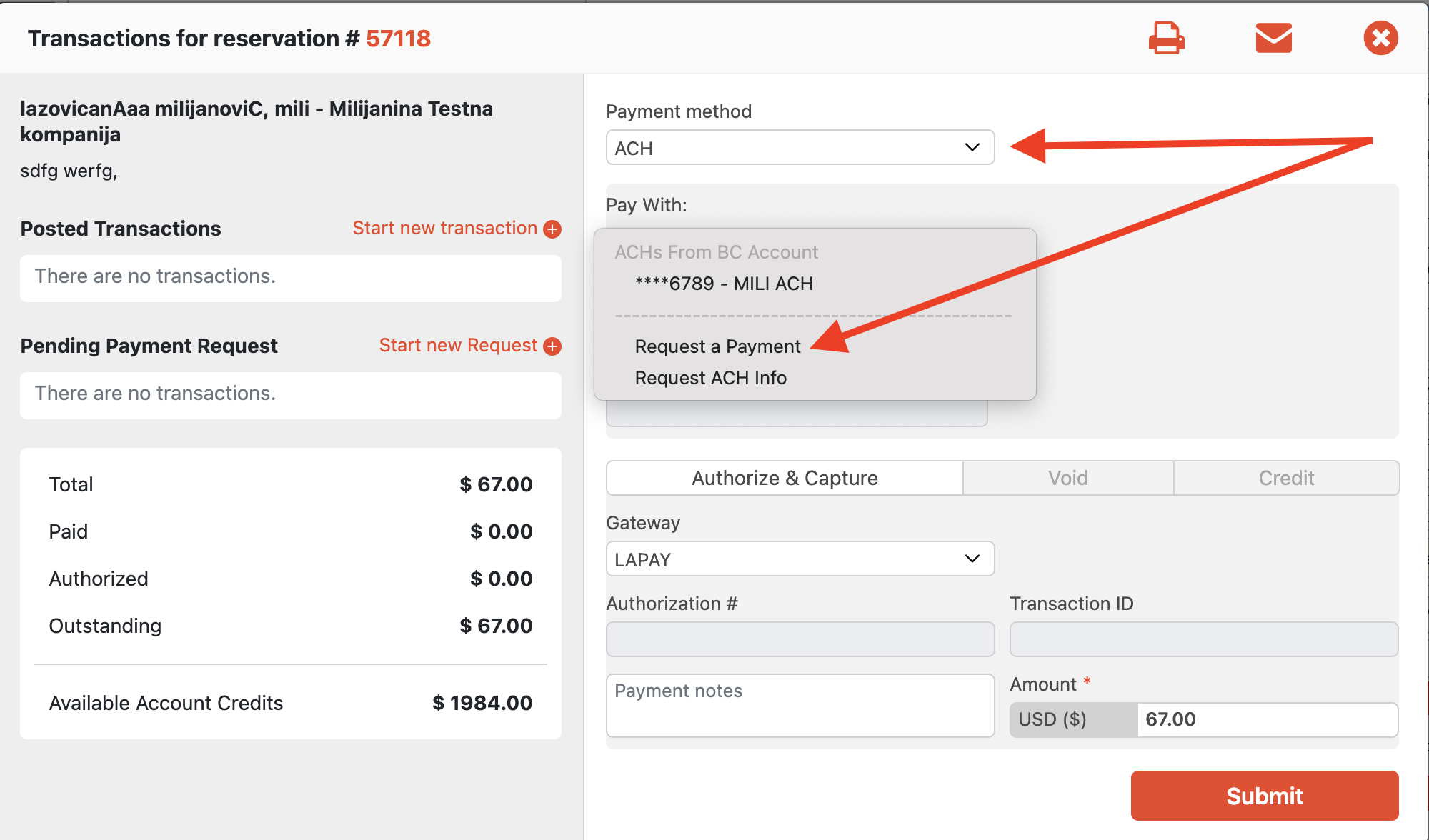 To send an ACH Payment Request: