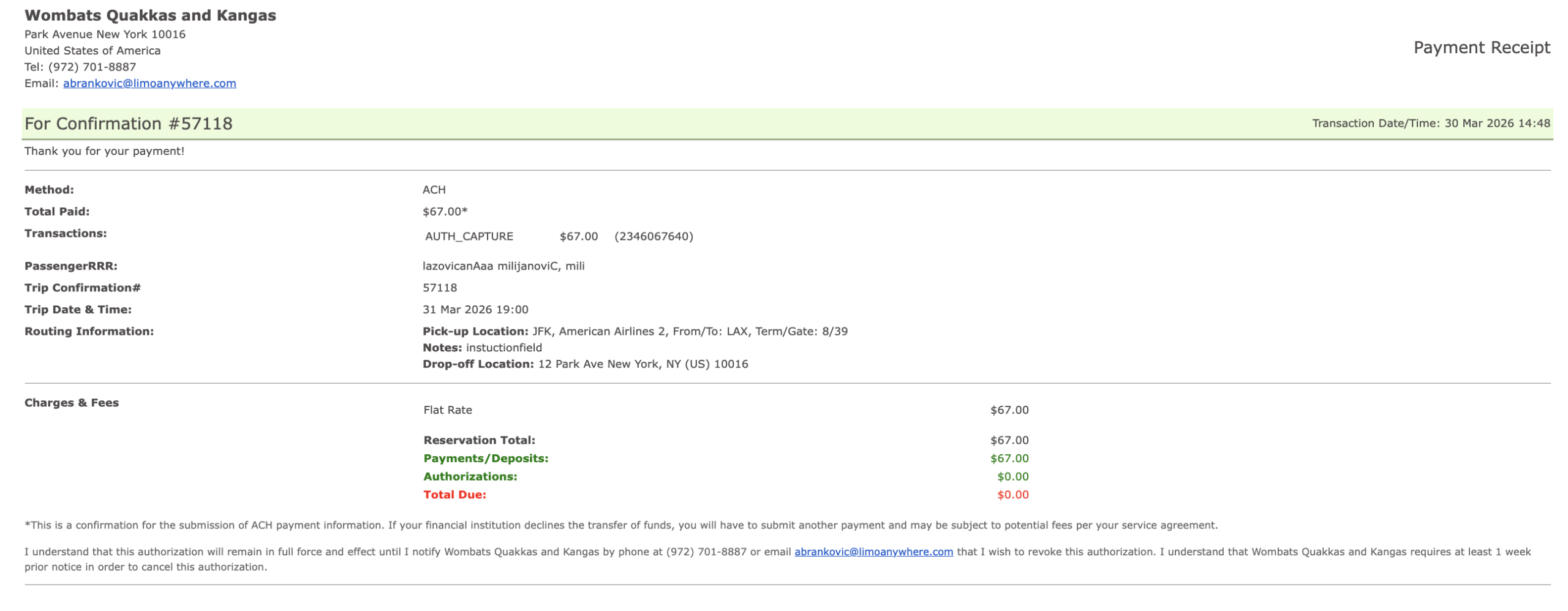- Your customer is taken to an ACH Authorization Confirmation page – they should print or save this for their records.