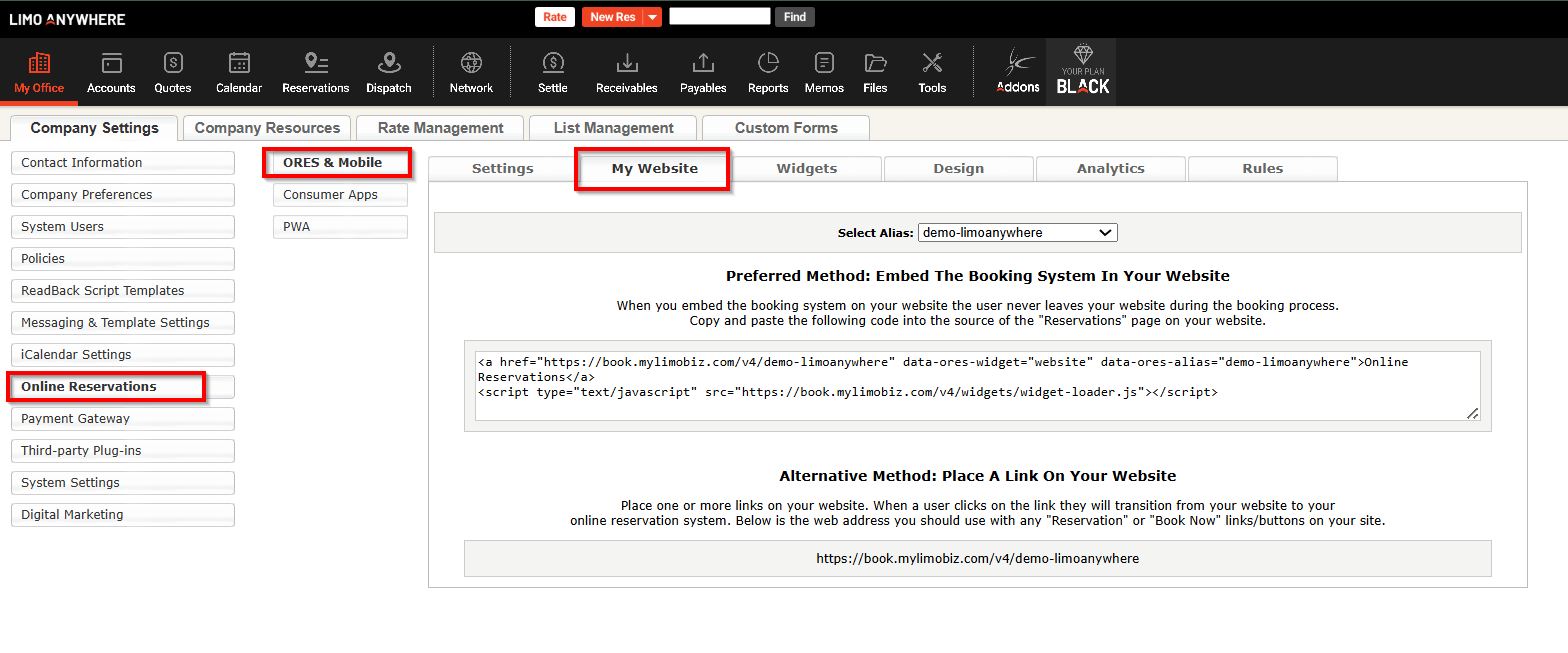 • If you are using Limo Anywhere CMS Websites (Hosted by Limo Anywhere)- after you have activated the ORES 4 module send an email to web@limoanywhere.com.  Make the subject of the email CMS/ORES 4.0 – <your Limo Anywhere Company ID>, and request integration of the ORES 4 into your website.