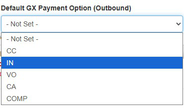 - Default GX Payment Option (Outbound). Select what payment method outbound trips should be sent as. In most cases this will be IN for invoice.
