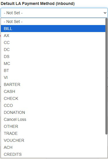 - Default LA Payment Method (Inbound). Set the default payment method for inbound trips. In most cases this will be BILL for Direct Bill Invoice.