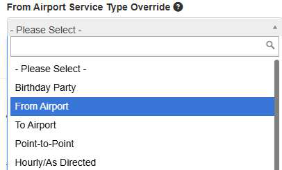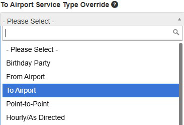 - To Airport Service Type Override. This setting will refer to the drop-o location of the reservation and if it is an airport, it will override the incoming service type and change to the service type selected here. In most cases this will be To Airport or Departure.