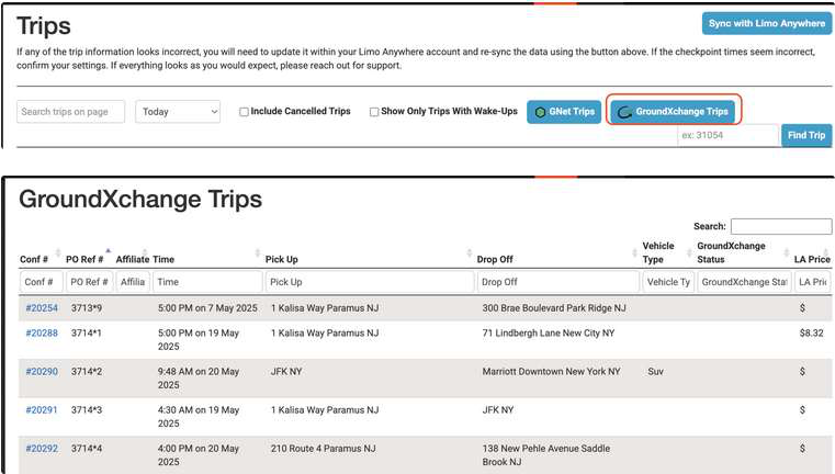 Operators can view a list of all trips received from GroundXchange in Addons>Trips>GroundXchange.