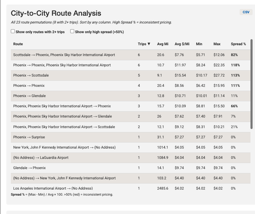 • Show only high spread (>50%) — Highlights routes where your pricing is most inconsistent