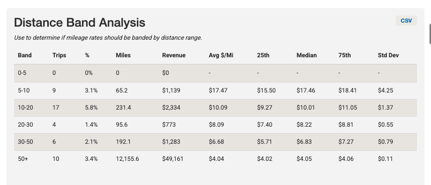 • Start with the Distance Band Analysis. It quickly shows whether shorter trips earn a higher per-mile rate than longer ones — the most common sign that tiered pricing could work.