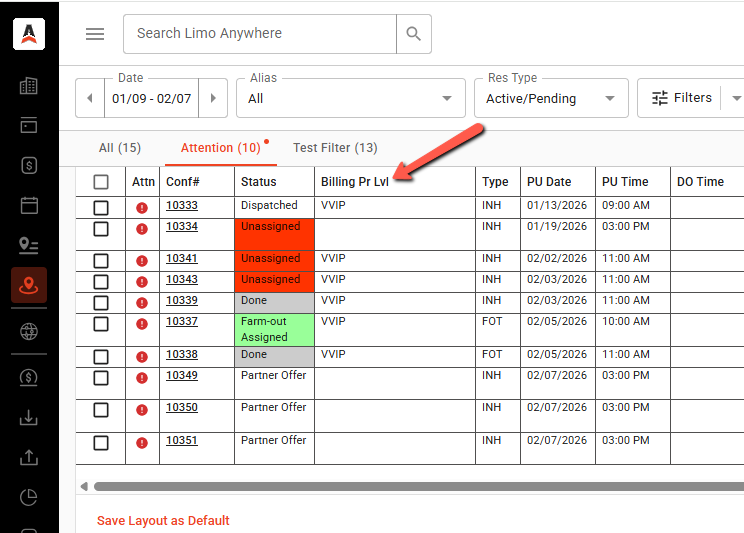 • New Dispatch – Billing Account Priority: Previously, on the Dispatch column/grid, there was only the option for the Priority Level for Passengers. We have added a column for Billing Account Priority, for the New Dispatch option.