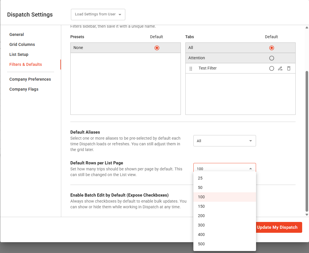 • New Dispatch – Extend option “Row per Page”: The previous option allowed to display from 25 – 200. With this update, the options for 300, 400, 500 have been added.