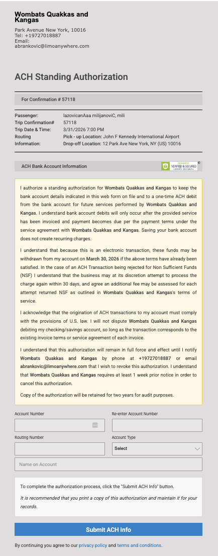 - A standing authorization agreement is presented to them, outlining that their bank details will be kept on file and used for future invoices per your service agreement.